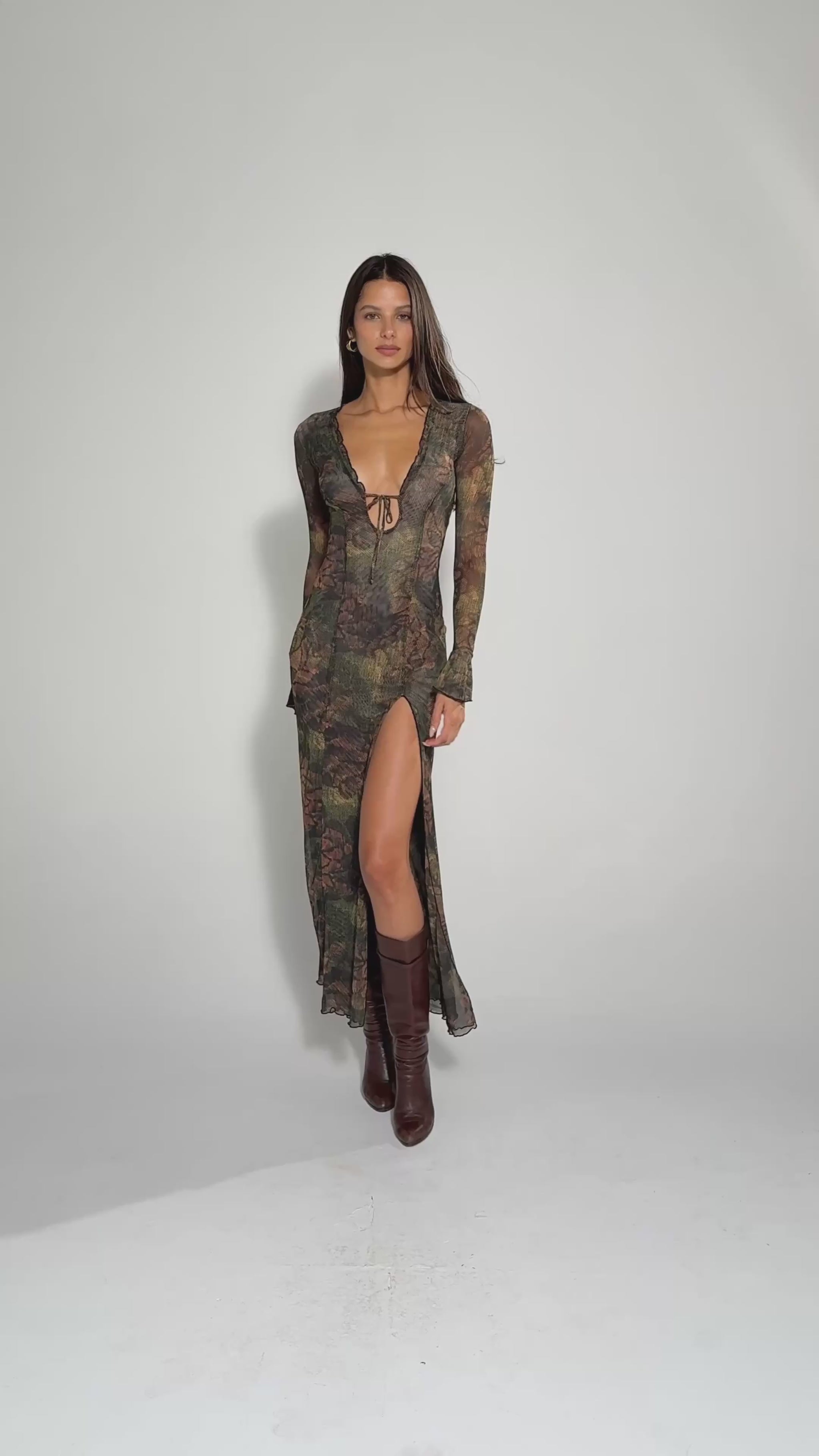 The Lennon Maxi in features a drop neckline and tie detail, front slit, and bell sleeves. Elevate your style with this elegant and sophisticated design, perfect for any occasion.